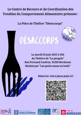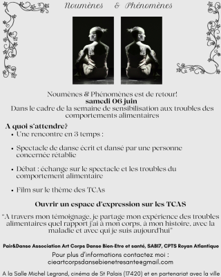 Une rencontre en 3 temps : Spectacle de danse écrit et dansé par une personne concernée rétablie Débat : échange sur le spectacle et les troubles du comportement alimentaire Film sur le thème des TCAs