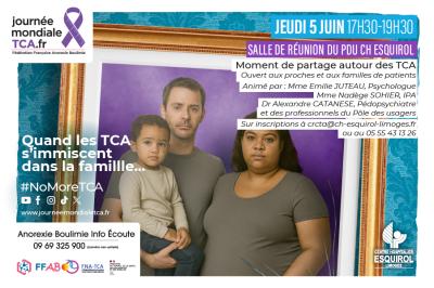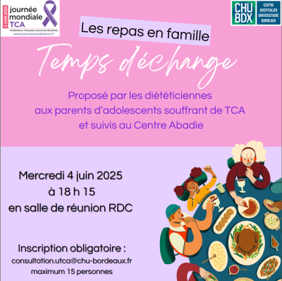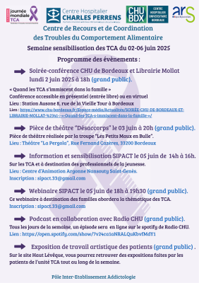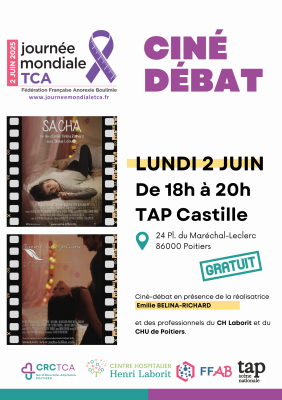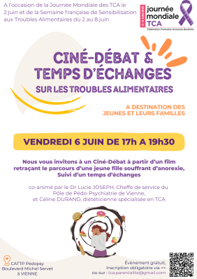 Dans le cadre de la semaine mondiale des TCA, la CMME organise le 6 juin un évènement de rencontre dans le hall de la CMME sur le thème "Échanges; soignés, proches et soignants, ouvrons la discussion" Débats et animations musicales sont prévus.