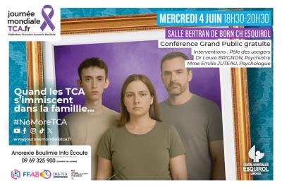 À l’occasion de la Journée mondiale des TCA, les partenaires du réseau TCA en Vendée se mobilisent et vous proposent une soirée d’information et d’échanges. Celle-ci se tiendra au sein de l'EPSM Mazurelle de La Roche sur Yon le 4 juin à 18h30.