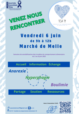 Pour la semaine de la sensibilisation nationale des TCA ( troubles du comportement alimentaire), l'association TCA79 vous invite à venir échanger avec ses bénévoles pour mieux connaître ce que sont ces troubles.