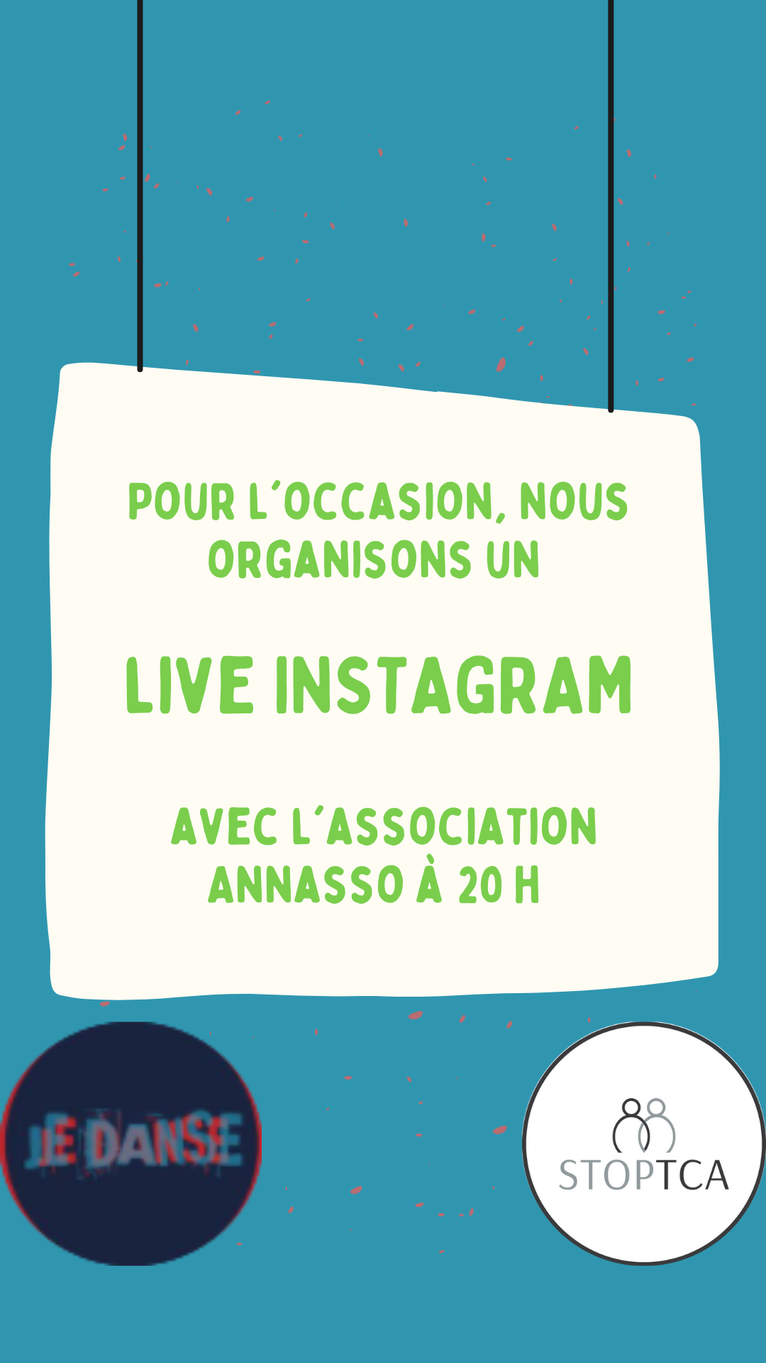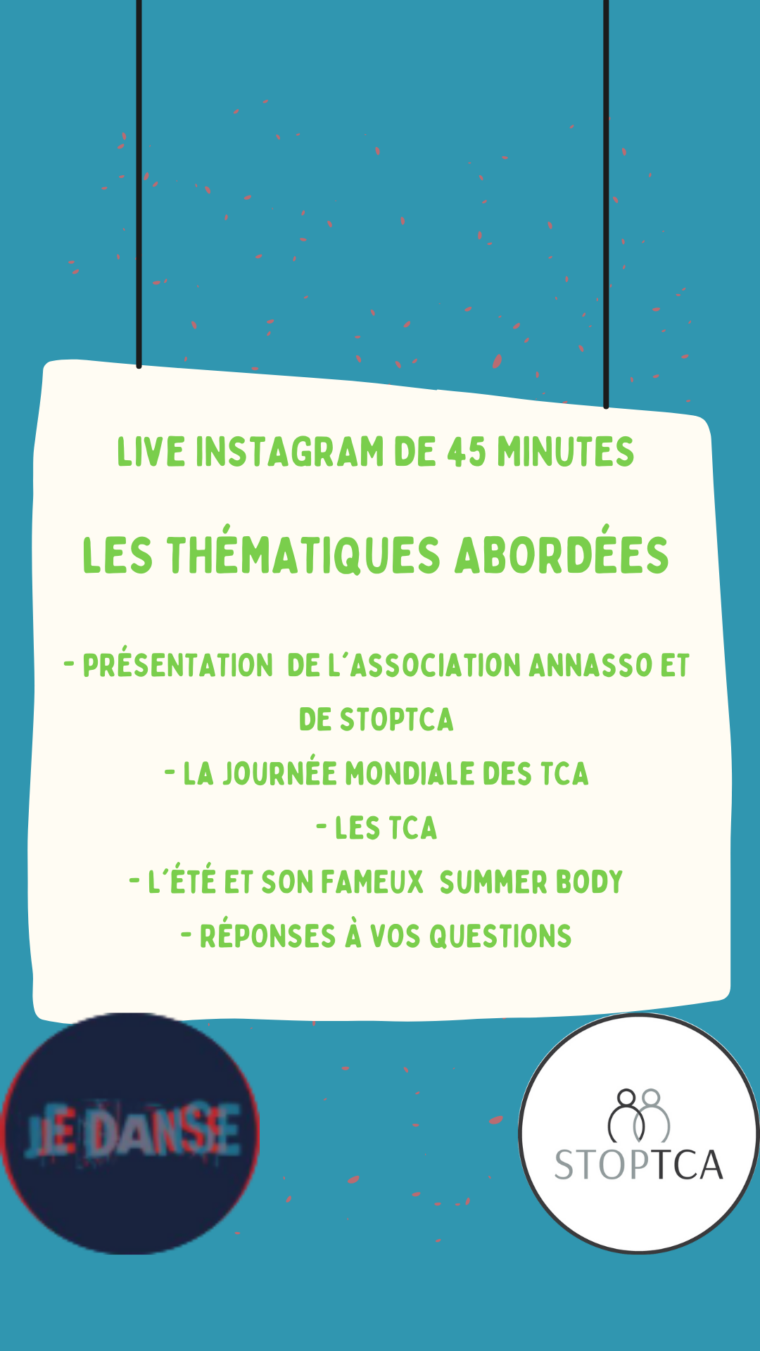 StopTCA, première plateforme de téléconsultation destinée à accompagner les patients souffrant de Troubles du Comportement Alimentaire, et les proches & l'Association Annasso, association pensée par Anna et créée en son hommage (Anna a souffert de troubles du comportement alimentaire et avait à coeur d’aider d’autres personnes à s’en sortir.) organisent un live instagram le 2 juin à 20 heures sur le compte instagram de StopTCA.